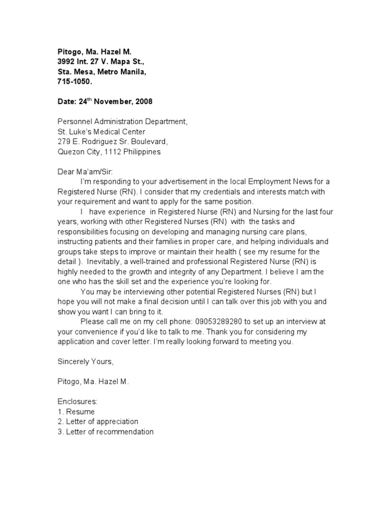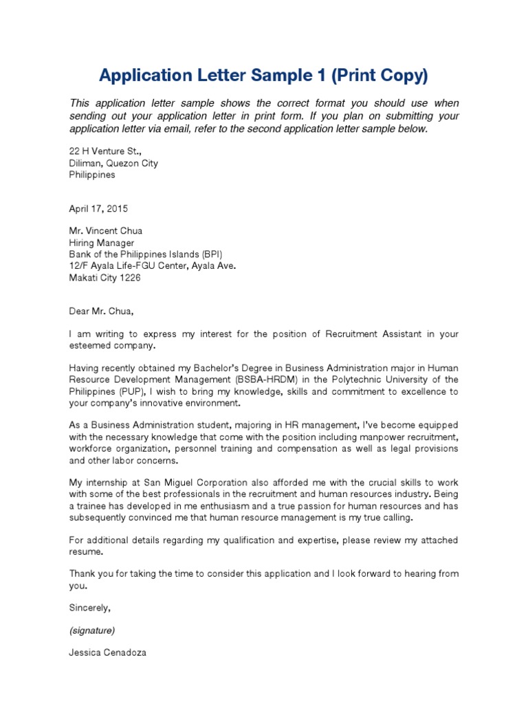 Application letter sample for job philippines. Sample letter for application should catch the attention of the hiring personnel and make them get to your resume. Make it a point to include the necessary email subject when sending your application letter via email. While your resume offers a history of your work experience and an outline of your skills and accomplishments the job application letter you send to an employer explains why you are qualified for the position and should be. Open your letter with your intention and then immediately talk about your skills and your job history.