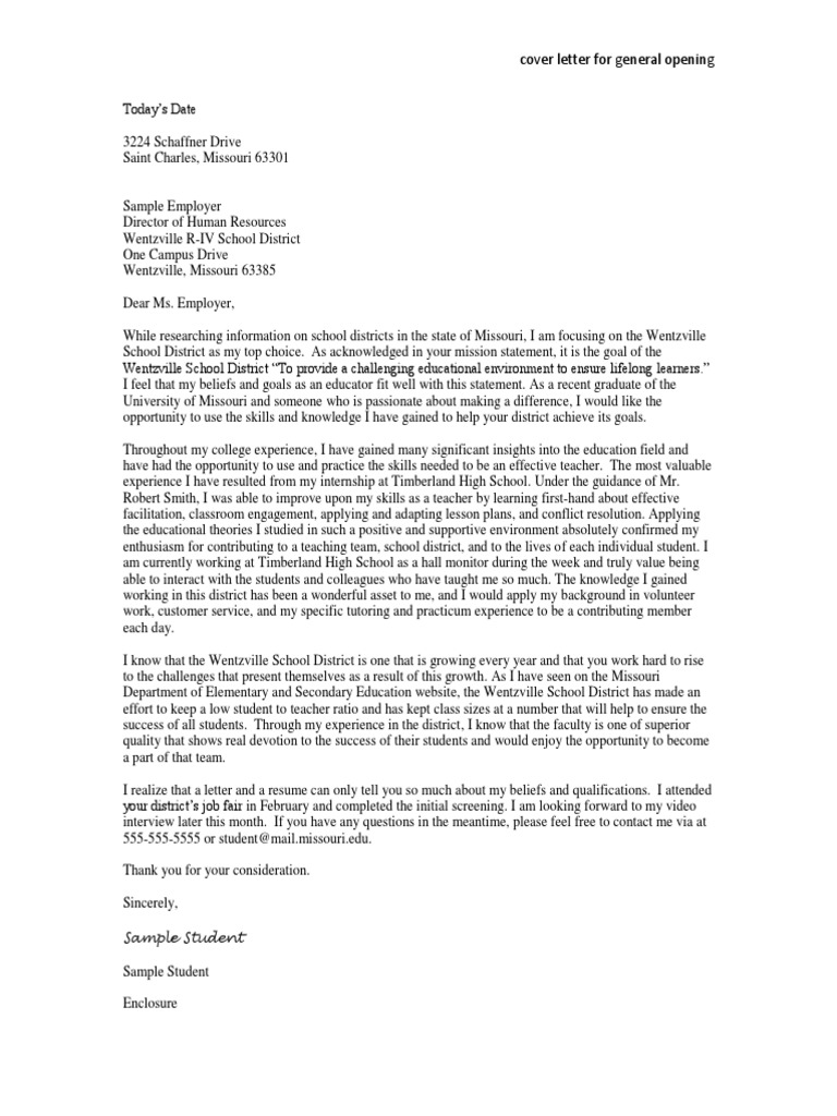 Cover Letter Sample General Position Teachers Cognitive Science
