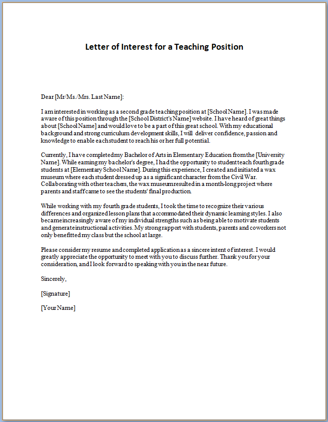 Letter Of Interest For Teaching Sample Templates
